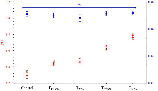 pH and Aw values of canned pâtés with replacement of pork meat using isolated pea protein. Different letters indicate significant differences based on Tukey’s test (p < 0.05). Error bars depict the standard error of the average. Batches—control: 100% pork meat; reformulated pâtés: substitution of 12.5% (T12.5%), 25% (T25%), 37.5% (T37.5%), and 50% (T50%) of pork meat with pre-hydrated isolated pea protein (1:3). ns: not significant.