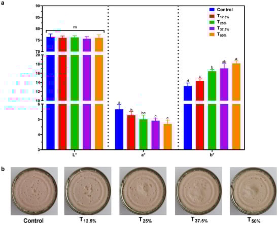 Instrumental color (a) and appearance (b) of canned pâtés with replacement of pork meat using isolated pea protein. Different letters indicate significant differences based on Tukey’s test (p < 0.05). Error bars depict the standard error of the average. Batches—control: 100% pork meat; reformulated pâtés: substitution of 12.5% (T12.5%), 25% (T25%), 37.5% (T37.5%), and 50% (T50%) of pork meat with pre-hydrated isolated pea protein (1:3). ns: not significant.