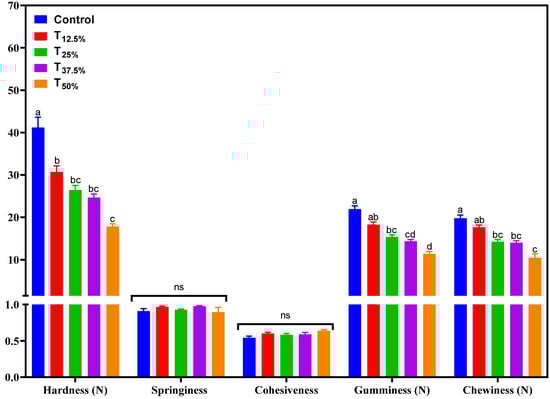 Texture profile of canned pâtés with replacement of pork meat using isolated pea protein. Different letters indicate significant differences based on Tukey’s test (p < 0.05). Error bars depict the standard error of the average. Batches—control: 100% pork meat; reformulated pâtés: substitution of 12.5% (T12.5%), 25% (T25%), 37.5% (T37.5%), and 50% (T50%) of pork meat with pre-hydrated isolated pea protein (1:3). ns: not significant.