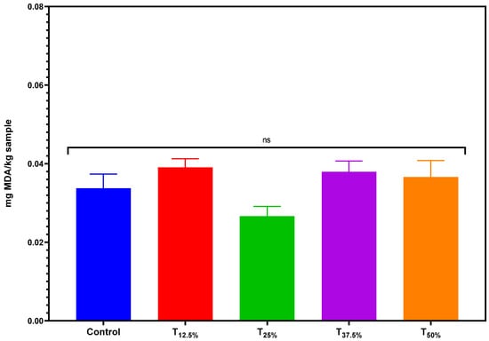 TBARS values of canned pâtés with replacement of pork meat using isolated pea protein. Error bars depict the standard error of the average. Batches—control: 100% pork meat; reformulated pâtés: substitution of 12.5% (T12.5%), 25% (T25%), 37.5% (T37.5%), and 50% (T50%) of pork meat with pre-hydrated isolated pea protein (1:3). ns: not significant.