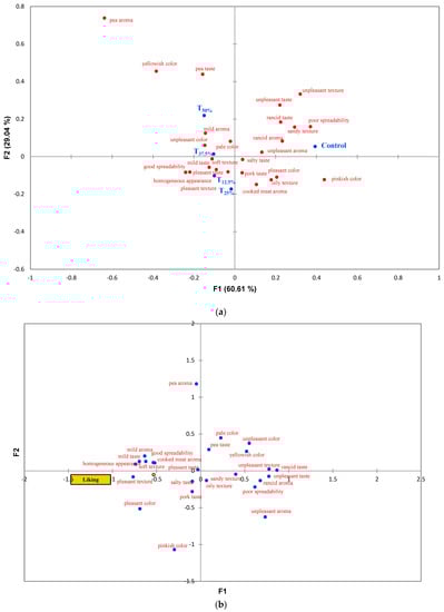 (a) Correspondence analysis used to analyze the CATA questionnaire. (b) Principal coordinate analysis used to analyze the correlation between the liking scores and CATA descriptors. Batches—control: 100% pork meat; reformulated pâtés: substitution of 12.5% (T12.5%), 25% (T25%), 37.5% (T37.5%), and 50% (T50%) of pork meat with pre-hydrated isolated pea protein (1:3).