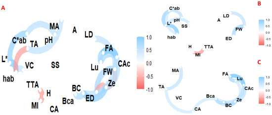 Figure 3A,C). For example, soil pH was positively correlated with soil organic matter and manganese, and with ash, colour, soluble solids, citric acid and β-cryptoxanthin in the fruit. In addition, soil electrical conductivity was correlated with soil calcium, iron, and manganese, as well as with ash, citric acid, soluble solids, luteolin and β-cryptoxanthin in the fruit. On the other hand, soil phosphorus was correlated with soil calcium, cation exchange capacity and soil iron, as well as with soluble solids, vitamin C, luteolin and β-carotene in the fruit. Similarly, a correlation was found between soil nitrate concentration and soil phosphorus, calcium, magnesium, cation exchange capacity, iron, and zinc, as well as with ash, soluble solids, maturity index, ferulic acid and caffeic acid in the fruit. Regarding colour parameters, a correlation was observed between L* and the presence of luteolin, caffeic acid and lutein, while C