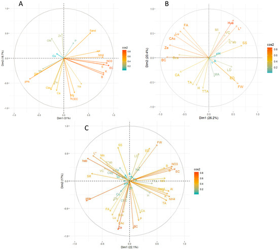 Figure 3A). On the other hand, ammonium, nitrate, electrical conductivity, potassium, and boron had a positive contribution, while pH had a negative contribution to component 2. Regarding fruit quality (