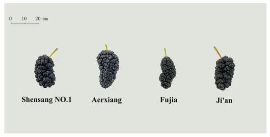 The fresh mulberries are shown in Figure 1. The BL range of the four mulberries was 22.23–27.71 mm, the BWI range was 11.73–12.93 mm, and the BWE range was 2.62–3.14 g, with A’erxiang berries having the greatest sizes and weights. A fruit’s moisture percentage is a key factor for determining its shelf life and edible acceptability. The freshness and the moisture level of a fruit determine how quickly it will degrade. The results were similar to those obtained by Nayab et al. [37], who found MCs in the range of 76.07–89.87% across four mulberry genotypes in Pakistan. In the present study, though Fujia was the smallest berry it was also the moistest. Berry size is a changeable property that varies based on environmental and agricultural factors [38]. Berry measurement and data collection are critical for the preservation of these mulberry genotypes [39].