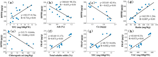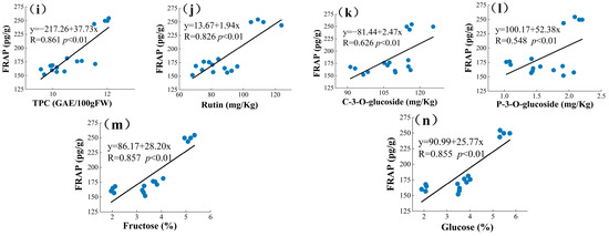 The correlation coefficient among phytochemical profile and antioxidant activities. Among them, (a–e) is the correlation between DPPH and each indicator, and (f–n) is the correlation between FRAP and each parameter.