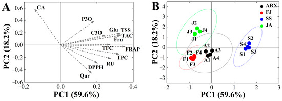 (A) PCA (PC 1 and PC 2) of mulberry genetypes including loading plots for TPC, TAC, TFC, antioxidant activity, and free sugar. (B) PCA score plot for four genetypes. Abbreviations: CA, Chlorogenic acid; C3O, C-3-O-glucoside; P3O, P-3-O-glucoside; RU, Rutin; Qur, Quercetin; TFC, the flavonoid content; TPC, the phenolics content; TAC, the anthocyanins content; Glu, Glucose; Fru, Fructose; TSS, Total soluble solids; SS, Shensang 1; ARX, Aerxiang; FJ, Fujia; JA, Ji’an.