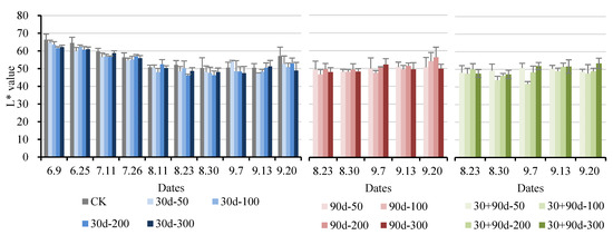 Changes in L* value of fruit for different MT-spraying schemes.