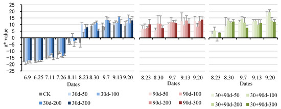 The a* value represents the red and green colors: the value is positive for redness and negative for greenness. Figure 6 shows that the a* value of ‘Yuluxiang’ pear fruit demonstrated a rising trend. The a* values for the different MT-spraying schemes were higher than that of CK to varying degrees. The a* value of CK was lower during the entire development process, whereas that for the 30 + 90 d-100 treatment was higher in the late stage of fruit development. On 23 August, the a* value for the MT treatments were positive, whereas the a* value of CK was still negative. At the mature stage, the a* value for the 30 + 90 d-100 treatment was the highest at 19.22, 110.1% higher than that of CK, indicating that exogenous MT treatment promoted pear fruit redness. Among these, the 30 + 90 d-100 treatment showed the best effect.