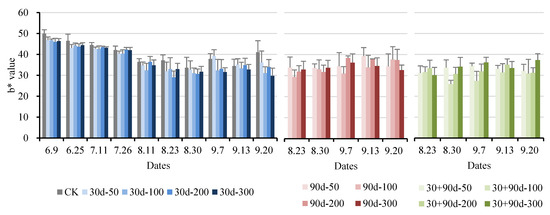 Changes in fruit b* value for different MT-spraying schemes.