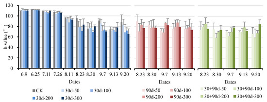 The hue angle, h, represents the color difference in the peel. The h values of 270°, 180°, 90°, and 0° are expressed as blue, green, yellow, and red, respectively. The smaller the h value, the greater the color change in the peel. As shown in Figure 9, the h value of pears showed a decreasing trend after exogenous MT treatment, and the h value of CK was always high. At the maturity stage, the h value for the 30 + 90 d-100 treatment was the smallest, 33.0% lower than that of CK, indicating that exogenous MT treatment promoted the redness of pear fruit, and the effect of the 30 + 90 d-100 treatment was the best.