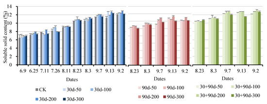 As shown in Figure 10, spraying MT affected the soluble solid content of pear fruit during development. From 9 June to 11 August, spraying different MT concentrations increased the soluble solid content of the pear fruit. After 23 August, the soluble solids content for the 90 d-200, 30 + 90 d-100, and 30 + 90 d-200 treatments increased rapidly. On 13 September, the soluble solids content for the 90 d-200 treatment reached the highest level at 13.3%, 4.5% higher than that of CK. The soluble solids contents for the 30 + 90 d-100 and 30 + 90 d-200 treatments were the highest at 12.7% and 13.0%, as well as 5.6% and 7.9%, respectively, higher than that for CK.