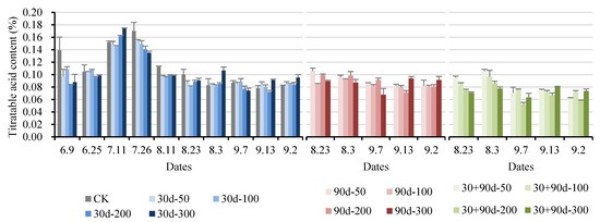Changes in fruit titratable acid content for different MT-spraying schemes.