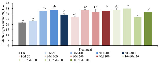 Soluble sugar content of fruit in mature stage for different MT-spraying schemes. Different lowercase letters indicate that the content of soluble sugar was significantly different in different treatments (p < 0.05).