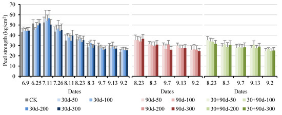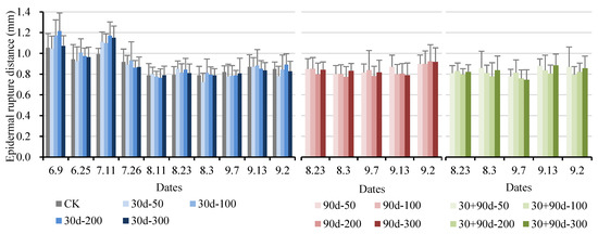 The epidermal rupture distance refers to the puncture distance when the peel is ruptured after the fruit is punctured, which can indicate the toughness of the peel. As shown in Figure 13, in the early stage of fruit development, the epidermal rupture distance for the 30 d-100 and 30 d-200 treatments increased compared to that for CK. After 11 July, the epidermal rupture distance for each treatment was not significantly different (p > 0.05), showing no regular changes.