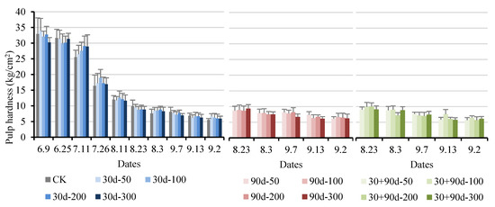 Figure 15 shows that the pulp hardness of ‘Yuluxiang’ pears gradually decreased with fruit ripening. The different MT treatments increased the average pulp hardness of pears to varying degrees, particularly during the mature stage. The average pulp hardness for the 90 d-200 treatment was the highest at 6.47 kg/cm2, 16.7% higher than that for CK. However, before fruit ripening, the pulp hardness after MT treatment showed a decreasing trend.