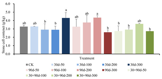 Changes in stone cell content of fruit in mature stage for different MT-spraying schemes. Different lowercase letters indicate that the content of the stone cell was significantly different in different treatments (p < 0.05).