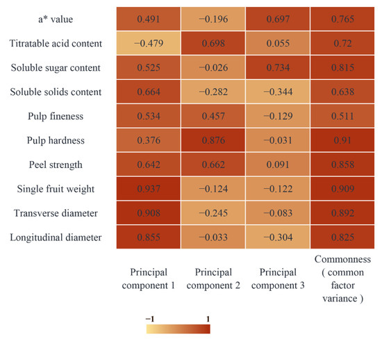 The importance of the hidden variables in each principal component was analyzed using a factor-load matrix heat map (Figure 18). In principal component 1, the load coefficients of single fruit weight, transverse diameter, and longitudinal diameter were 0.937, 0.908, and 0.855, respectively, which were important factors in determining the variance of the first principal component. The important factors in principal component 2 were pulp hardness, titratable acid content, and peel strength, with load coefficients of 0.876, 0.698, and 0.662, respectively. The load coefficients of soluble sugar content and a* value in principal component 3 were 0.734 and 0.697, respectively.
