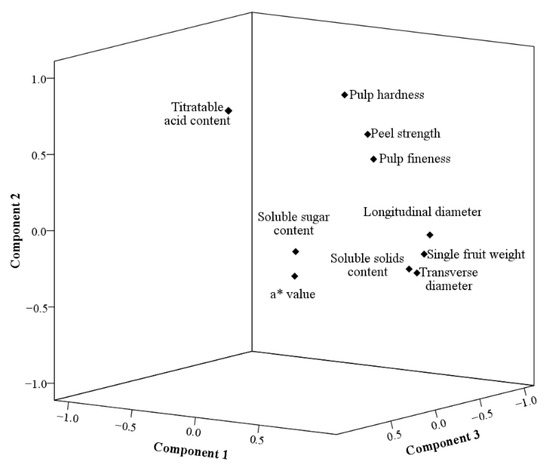 The factor-loading diagram reduced multiple factors into three principal components and presented the spatial distribution of the principal components through a quadrant diagram (Figure 19). A strong correlation was observed among pulp hardness, peel strength, and pulp fineness, as well as among longitudinal diameter, transverse diameter, single fruit weight, soluble solid content, soluble sugar, and a* value.