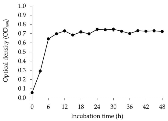E. faecium OV3-6 strain was cultured in MRS broth as detailed (refer to Section 2.3). The number of bacterial cells was estimated using optical density (OD) measurement [34]. The samples (at 0, 6, 12, 18, 24, 30, 36, 42, and 48 h) were analyzed with a multi-mode microplate reader (model Beckman Coulter DTX 880, Fullerton, CA, USA) at a wavelength of 595 nm.