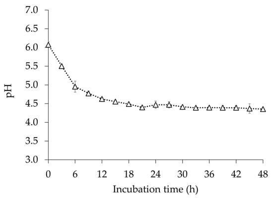 The assessment of pH change provides information about the utilization of sugars in the medium and fermentation. pH of the medium during E. faecium OV3-6 cultivation was exhibited in the range of 4.34 ± 0.04 to 6.08 ± 0.08. During E. faecium OV3-6 cultivation, the pH value of the medium gradually decreased. The lowest (4.34 ± 0.04) and highest (6.08 ± 0.08) pH values were observed at 48 and 0 h of the cultivation, respectively (Figure 2).