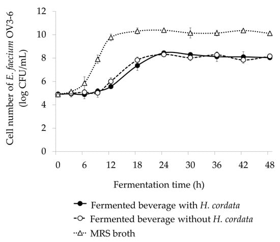 The growth of E. faecium OV3-6 in fermented beverage (FB) with and without H. cordata and MRS broth. Error bars represent the standard deviation of experimental triplicates.