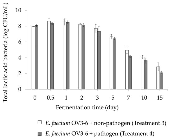 Treatments 3 and 4 showed their LAB content until 15 days of fermentation. In the presence of pathogens, the growth of E. faecium OV3-6 was not affected in FHBs (Figure 5). The study reported that bacteriocin-producing L. plantarum LPL-1 could change the microbial community in low-salt fermented sausages [21]. However, LAB’s efficiency in fermentation depends on various factors such as nutrient composition, time, pH, temperature, material ingredients, and antagonistic microorganisms [71,72]. Additionally, most LAB strains are probiotics with health-promoting properties [73]. We previously reported that E. faecium OV3-6 has in vitro probiotic activity [32].