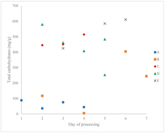 The carbohydrate content of the sugar sands (Table 2, Figure 1 and published values in Supplementary Table S2) can vary by over 100-fold from one producer to another and nearly as much from a single producer, and it varies widely from one sap harvesting day to the next. Producers B and D, in particular, show great daily variability. This may be due to daily differences in processing (e.g., filter conditions, rinse water volume, etc.). Such variation has long been known (e.g., 4.40–85.22% according to [42]), suggesting that the yield of maple syrup could be increased by maximizing the desugaring of the filter cake (sugar sand).