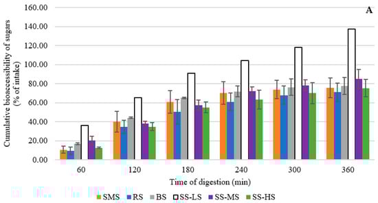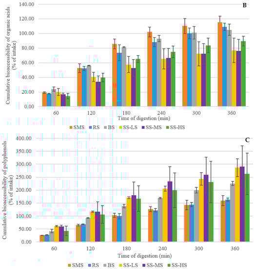 Figure 2B shows two different patterns for organic acid absorption. Organic acids are absorbed completely from the syrups after 300 min—even by more than 100% relative to the input. These excess absorption values are probably due to differences between our extraction efficiency for by-product content analysis and extraction of the same compounds under the physicochemical conditions of the TIM-1, and hence, due to an underestimation of their actual concentrations in the samples. Since the pH in the gastric compartment is lower than the pKa of almost all carboxyl groups, the organic acid molecules are mostly protonated and therefore less inclined to complex with minerals. In addition, the temperature in the digestive tract (37 °C) may favor the release of organic acids. The 6 h digestion time versus 5 min laboratory extraction time may also be expected to increase organic acid solubilization, especially since the peristaltic movement likely provided more thorough mixing, and the higher liquid/solid ratio used in the simulator likely improved mass transfer. These parameters all need to be explored to determine if organic acid extraction during sample analysis is incomplete and needs improvement [49,50,51]. A more efficient treatment, feasible at large-scale such as hydrodynamic cavitation, may be necessary [52]. Finally, for organic acids, at the end of the simulated digestion, a significant difference was observed between the SMS and two samples: SMS-LS and SMS-MS (Dunnett’s test, p = 0.04), suggesting a lower nutritional value when the residual sugar content is low in sugar sand.