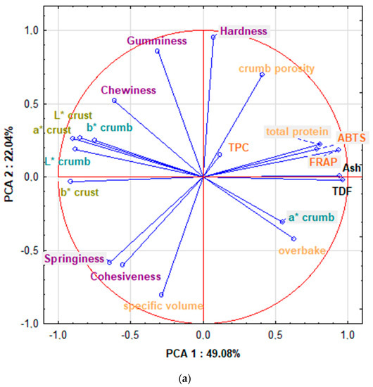 The PCA allowed for the determining of correlations between the quality traits, texture, nutritional content, antioxidant activity, and TPC of RB enriched with PF (Figure 1a,b). The significant values of the Pearson’s correlation coefficients determined in the study are included in the Supplementary Data, Table S1.