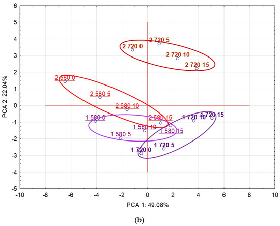 The PCA showed the diversity of bread obtained with different methods depending on the RF used (Figure 1b) and divided the bread samples assessed in the study into four groups; the most different from the others was the bread obtained by the two-phase method from flour type 720 (2 720). Bread obtained with the first method from both types of flour (1 580 and 1 720) and method 2 from flour type 580 (2 580) with different amounts of the additive was largely similar.