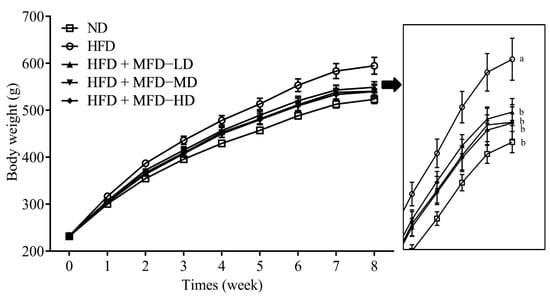 Effect of the Mei-Gin formula on body weight change in high-fat diet-induced obese rats. Data are presented as the mean ± SEM. Different letters for each test parameter are considered as statistical significance (p < 0.05). ND, normal diet; HFD, high-fat diet; HFD + MGD−LD, HFD treatment with low-dose Mei-Gin formula (50 mg/kg rat); HFD + MGD−MD, HFD treatment with medium-dose Mei-Gin formula (100 mg/kg rat); HFD + MGD−LD, HFD treatment with high-dose Mei-Gin formula (300 mg/kg rat).