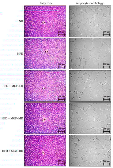 A histological examination was performed to explore the effects of MGF on lipid metabolism. The histological analysis of rats’ H&E-stained liver and perirenal adipose tissue is shown in Figure 2. Severe hepatosteatosis with the extensive vacuolization and accumulation of lipid droplets was observed in HFD supplementation rats, while rats in the ND group exhibited lined hepatic sinusoids without the infiltration of lipid droplets or hepatocyte swelling. In contrast, MGF-supplemented rats exhibited reduced lipid droplet accumulation in hepatic intracellular vacuoles. The size of the perirenal adipose tissue cells presented a distended arrangement in rats fed the HFD, while the supplementation of MGF significantly reversed the HFD-induced increase in cell size in this area.