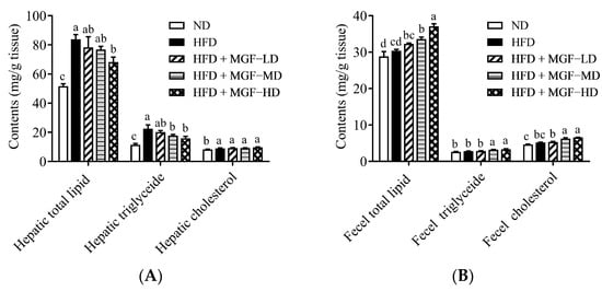 The effect of HFD supplemented with MGF on the hepatic and fecal total lipids, TG, and cholesterol of rats is shown in Figure 3. Supplementation with HFD produced considerably higher levels of total lipids, TG, and cholesterol levels than in the ND group. The HFD + MGF group (HD) exhibited the lowest levels of total liver lipids and TG, while the hepatic TG and cholesterol levels in the HFD + MGF groups (MD and HD) were significantly decreased. However, hepatic cholesterol in the MGF-supplemented groups did not differ significantly from that in the HFD group. Furthermore, the results also showed that MGF supplementation led to an increase in fecal lipids, TG, and cholesterol secretion in the HFD + MGF groups (MD and HD).