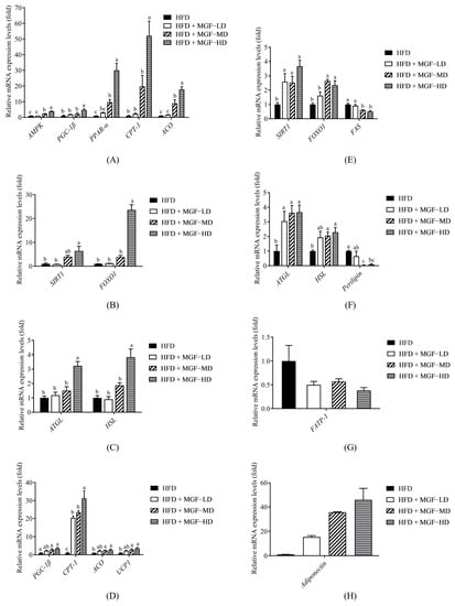 To further explore the reduction in hepatic steatosis and fat mass in MGF-supplemented rats and whether it is accompanied by altered lipid metabolism, quantitative RT-PCR was performed. Compared with the HFD group, the liver β-oxidation-related gene expression of AMPK (MD and HD), PGC-1β (HD), PPAR-α (MD and HD), CPT-1 (HD), and ACO (MD and HD) was significantly increased after MGF supplementation (Figure 4A). Furthermore, the genes associated with fatty acid synthesis, SIRT1 and FOXO1, were increased in the HFD + MGF group (HD) as compared to the HFD group (Figure 4B). In the HFD + MGF group (HD), the gene expression of ATGL and HSL significantly increased, which indicated an enhancement in lipolysis (Figure 4C). Furthermore, a similar tendency for gene expression involved in lipid metabolism was found in the perirenal adipose tissue. An elevated trend was observed in the mRNA levels of PGC-1β (MD and HD), CPT-1 (LD, MD, and HD), ACO (MD and HD), and UCP-1 (MD and HD) after MGF supplementation (Figure 4D). Furthermore, the expression of the SIRT1 (LD, MD, and HD) and FOXO1 (MD and HD) genes was elevated after MGF supplementation, while the level of FAS (MD and HD) was significantly decreased compared with that of the HFD group (Figure 4E). MGF significantly enhanced lipolysis by increasing the expression of ATGL (LD, MD, and HD) and HSL (MD and HD) mRNA and decreasing the expression of perilipin (MD and HD) (Figure 4F). Furthermore, we also observed that the HFD + MGF group (HD) had significantly lower expression of FATP mRNA (Figure 4G). In contrast, the HFD + MGF groups (MD and HD) had markedly increased adiponectin mRNA expression compared with the HFD group (Figure 4H).