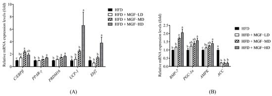 In addition to the direct effects of altering lipid metabolism via supplementation with MGF in HFD-induced obese rats, we further investigated the regulation of gene expression, which was also mediated by active energy expenditure to protect against obesity in BAT through thermogenesis and mitochondrial activity. Regulatory factors, including AMPK (MD and HD) BMP-7 (MD and HD), and PGC-1α (HD), were significantly increased, while the expression of the ACC gene (LD, MD, and HD) was significantly decreased in the BAT of the MGF-supplemented groups (Figure 5A). Furthermore, the thermogenic gene expression of C/EBPβ (MD and HD), PPAR-γ (HD), PRDM16 (MD and HD), UCP-1 (HD), and Ebf2 (HD) was significantly increased after MGF supplementation (Figure 5B).