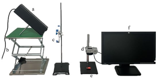 Main components of the laser transmission imaging system: laser transmitter (a), lifting platform (b), neutral filter (c), digital camera (d), sample holder (e), and computer (f).