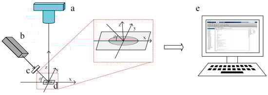 Laser spot image acquisition process based on digital camera (a), laser transmitter (b), neutral filter (c), fibre sample (d), and computer (e).
