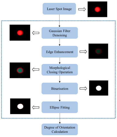 The processing steps for laser spot images and the changes to the images during the process are shown in Figure 3. The specific operating methods and corresponding effects of each image processing step are illustrated in Section 2.5.1, Section 2.5.2, Section 2.5.3, Section 2.5.4 and Section 2.5.5.