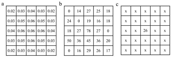Gaussian filter template with a size of 5 × 5 (a), and pixel values of the image before (b) and after (c) the Gaussian filter denoising process. The “x” in figure (c) does not refer specifically to any pixel value.