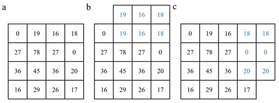 The image edges contain the most basic image shape feature parameters, and an enhanced denoising process of the laser spot image edges helps to identify the image edge features [36]. First, the edge filter operator Sobel in the MATLAB toolbox was used to detect the edges of the laser spot image, and then the outer edge pixel values were copied, and the corresponding data were extended to the periphery of the image, resulting in an edge enhancement effect [37]. A 3 × 3 edge filter template is used as an example to illustrate this process (Figure 5). Figure 5a shows the pixel values of the image before edge enhancement. Figure 5b,c depicts schematic illustrations of the results of edge enhancement at the top and right edges of the image, respectively. The desired edge enhancement effect for the whole image can be achieved by repeating the above operation around the edges of the image. In this way, the effects of 3 × 3 and 5 × 5 edge enhancement filter templates on the edges of the laser spot image were compared, and the optimal filter template was selected for further study.