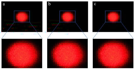 Based on the confirmation of the use of 3 × 3 Sobel edge filter templates, the appropriate size of Gaussian filter templates can be selected. Compared to the laser spot image processed with the 9 × 9 Gaussian filter template (Figure 9c), the boundary between the red and black regions of the red ellipse edges obtained with the 3 × 3 Gaussian filter template was bright and clear, as shown in Figure 9a. Since there were no significant differences between Figure 9a,b, both the 5 × 5 and 7 × 7 Gaussian filter templates were combined with the 3 × 3 Sobel edge filter template in subsequent image processing steps until the optimal Gaussian filter template was confirmed.