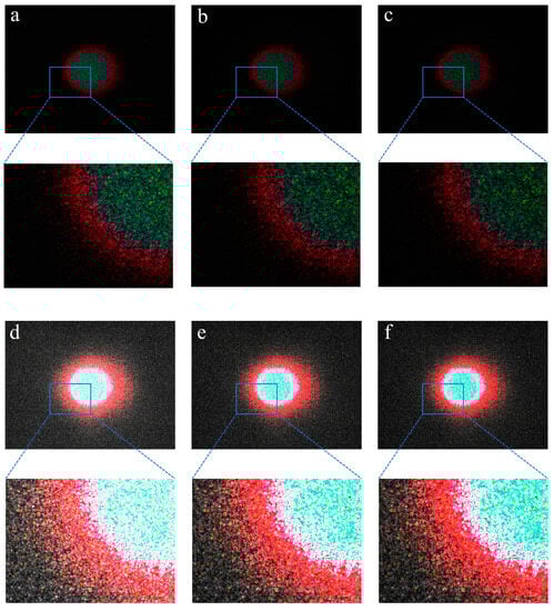Laser spot images processed with Gaussian and edge filter templates. (a–c) Images processed with 5 × 5, 7 × 7, and 9 × 9 Gaussian filter templates combined with the 3 × 3 Sobel edge filter template, respectively. (d–f) Images processed with 5 × 5, 7 × 7, and 9 × 9 Gaussian filter templates combined with the 5 × 5 Sobel edge filter template, respectively. The images connected by dotted lines are partially enlarged images.