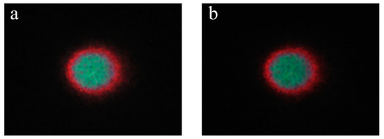 Laser spot images obtained with 5 × 5 (a) and 7 × 7 (b) Gaussian filter templates, followed by the 3 × 3 Sobel edge filter template and the morphological smoothing operation.