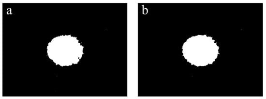 Laser spot images processed with 5 × 5 (a) and 7 × 7 (b) Gaussian filter templates, respectively, followed by the operations of the 3 × 3 Sobel edge filter template, the morphological smoothing operation, and the binarisation treatment.