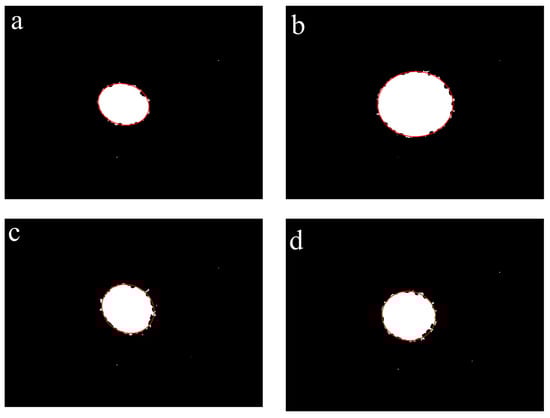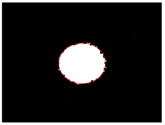 After the image processing described in Section 3.2.1, Section 3.2.2, Section 3.2.3 and Section 3.2.4, the boundaries of the laser spots were relatively clear, and an ellipse could be fitted directly from the outermost coordinate points of the image. The results of the fitted ellipses are shown as the solid red line in Figure 12.