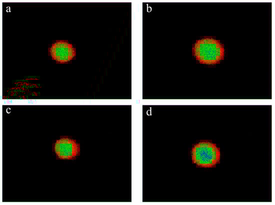 Pseudocolour maps extracted from laser spot images for extruded beef jerky (a), pork jerky (b), chicken jerky (c), and duck jerky (d).