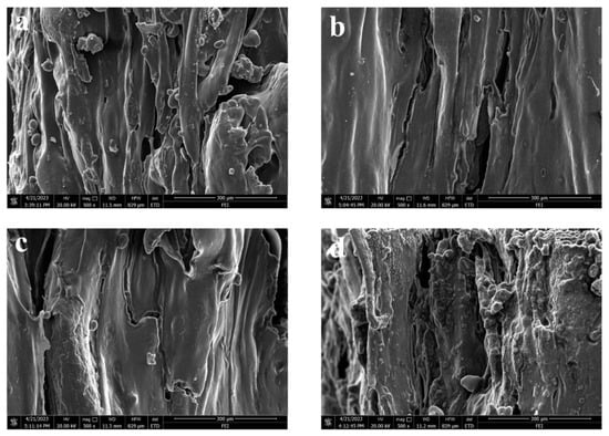 The structural characteristics of the extruded jerky are shown in Figure 15 to further validate the reasonableness of the above ranking of the degree of orientation of the extruded jerky samples. Without any data support, it still shows the basic trend of fibre orientation. Overall, the fibre microstructure in the extruded beef jerky appears to have the best orientation effects (Figure 15a), although ingredients such as soya bean isolate protein and potato starch, adhering to the surface of the samples, may affect the reliability of the degree of orientation results. The micrographs of the extruded pork and chicken jerky in Figure 15b,c show the next best fibre orientation effects, whereas the duck jerky in Figure 15d appears to have poor fibre orientation. There is clearly a significant difference in the orientation effects between Figure 15a,d. These results confirm that the ranking trend in the degree of orientation (beef jerky > pork jerky > chicken jerky > duck jerky) is reasonable from another point of view, indicating that the method for determining the degree of orientation is reliable.