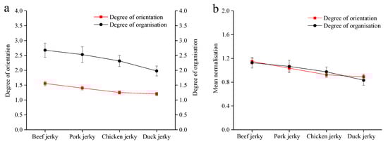 The ascending order of the mean for the degree of organisation is beef jerky > pork jerky > chicken jerky > duck jerky, which corresponds to the ranking of the data for the degree of orientation (Figure 16a). As shown in Figure 16b, the results after the normalisation treatment show significantly similar trends, and the results of the data correlation analysis show that the degree of organisation and the degree of orientation have a significantly strong positive correlation with each other (r = 0.68, in the range of 0.6–0.8, p < 0.01), confirming that this newly developed method for determining the degree of orientation is reliable.