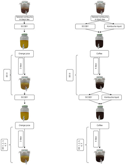 The origin and composition of kombucha culture and growth matrix and the number of backslopping cycles influence the chemical and microbial properties of the final product [5,14]. Due to the growing popularity of commercial kombuchas, producers are finding ways to introduce new flavours and nuances for this traditional drink. One of the ways is to modify the SCOBY by introducing new bacterial cultures that affect the sensory properties of the drink. Another option is to replace the classical growth environment, usually black or green tea, with a new one. However, it is important to maintain the constant quality of every batch of the final product and obtain stable and reproducible results, which could be possible with the application of backslopping technology. An examination of the effects of SCOBY modification and a profound description of chemical and microbial changes in kombucha community in different novel growth media during backslopping has not been implemented yet. Therefore, we wanted to characterise modified kombucha fermentation in new environments using backslopping methodology with continuous chemical and microbiological monitoring throughout. Based on the research in two different media, orange juice and coffee infusion, in this work we provide valuable information regarding the aspects to consider for this type of kombucha production and what are the main drawbacks to be solved.