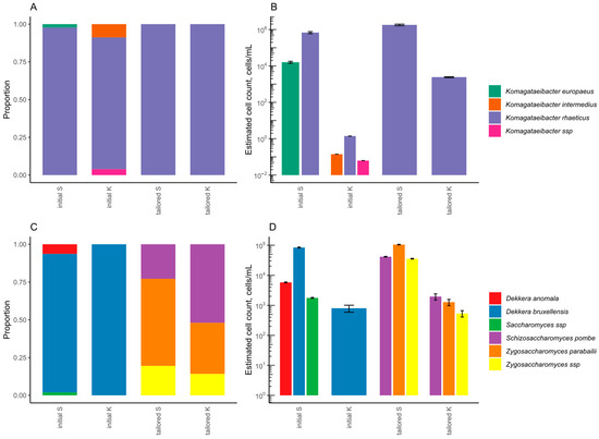 Microbial composition of initial and tailored kombucha at the end of the backslopping process according to 16S NGS for bacteria (A,B) and ITS2 NGS for yeast (C,D), graphed as relative (A,C) and normalised abundances (B,D). The abbreviation S stands for SCOBY, and K for kombucha liquid.